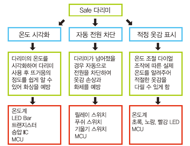 다리미의 전원이 켜진 상태에서 실수로 다리미가 넘어진다면 옷감이 타거나, 심할 경우 화재가 일어날 수 있다. 이러한 경우를 예방하기 위해 기울기 스위치와 푸쉬 스위치를 사용하여 위험 상황 여부를 판단하고, 만약 위험 상황이 발생할 경우 릴레이 스위치를 OFF 시켜 전원을 자동으로 차단한다.