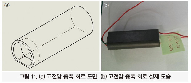 <그림 11>은 앞에서 실험을 통하여 선정한 고전압 증폭 회로(下)를 도면과 사진으로 나타낸 것이다. 고전압 증폭 장치란 10V 미만의 전압을 1kV 이상의 전압으로 증폭시키는 장치를 말한다. 고전압 증폭 회로는 입력된 전압을 수백 내지 수천 배 증폭시킨다. 본 제품에서 사용하는 회로는 건전지로부터 3V의 전원을 공급받으면 고전압 증폭 회로 내에서 약 5kV 전압으로 증폭시킨다. 증폭된 전압은 +극은 원료 방출부에, -극은 안전장치에 연결되고 앞에서 설명한 것처럼 전기 방사가 이루어진다. 고전압이 흐르기 때문에 안전을 위해 플라스틱 케이스로 보호되어있다.