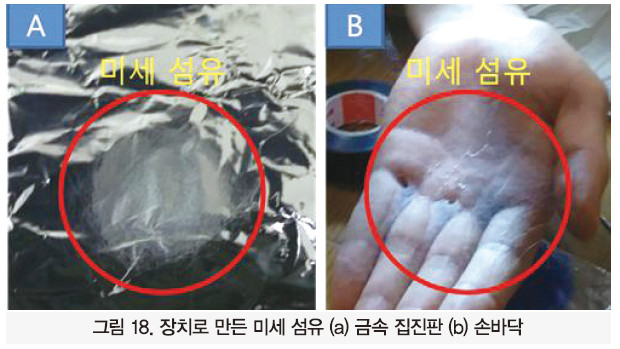 <그림 18>은 제작된 장치를 이용해 5분 가량 전기방사를 한 모습이다. 장치는 한 번에 최대 1시간에서 1시간 30분 정도 작동 가능하였다. 첨부된 이미지에서 볼 수 있듯이, 금속 집진판이나 손바닥에서 모두 균일하게 미세 섬유가 제작되는 것을 확인할 수 있다.