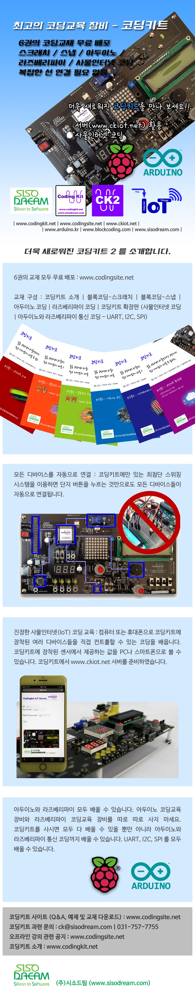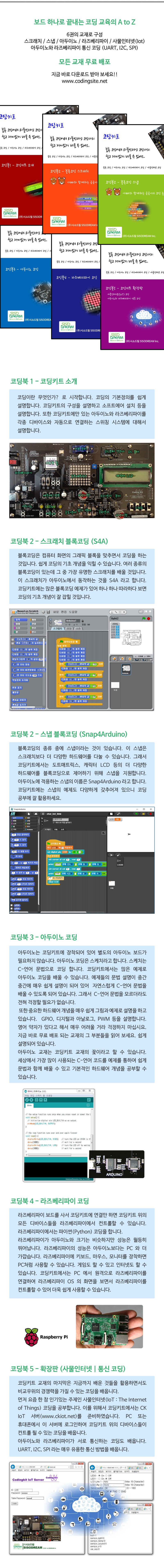키트 외에 교재를 따로 구매할 필요가 없이 6권의 코딩교재 ‘코딩북’을 통해 A 부터 Z까지 스스로 배울 수 있어 실용적이다. 교재는 코딩키트 커뮤니티 코딩사이트(http://www.codingsite.net/)에서 무료 배포중이며 코딩키트 소개 / 블록코딩-스크래치 / 블록코딩-스냅 / 아두이노 코딩 / 라즈베리파이 코딩 / 코딩키트 확장판 (사물인터넷 코딩 / 아두이노와 라즈베리파이 통신 코딩 – UART,I2C,SPI)로 구성되어 있다. 이 교재는 사용자가 코딩을 전혀 모른다는 가정하에 쓰여져 있어 이해하기 쉽다. 컴퓨터 언어의 개념 및 문법 등을 설명하면서 수많은 예제를 이용하여 코딩 보드에 있는 디바이스들을 컨트롤해 스스로 코딩을 잘할 수 있도록 도와준다. 커뮤니티 안에는 다수의 코딩 키트 관련 자료가 갖추어져 있으며 질의응답도 가능하다.
