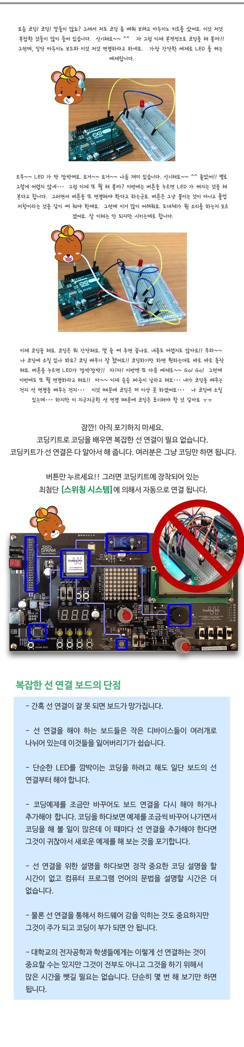 버튼 하나를 누르면 최첨단 스위칭 시스템에 의해서 자동으로 연결된다. 사용자는 복잡한 선 연결을 하지않아 중요한 코딩을 여러번 해볼 수 있는 시간을 확보해 다양한 사물인터넷 코딩에 집중할 수 있다.