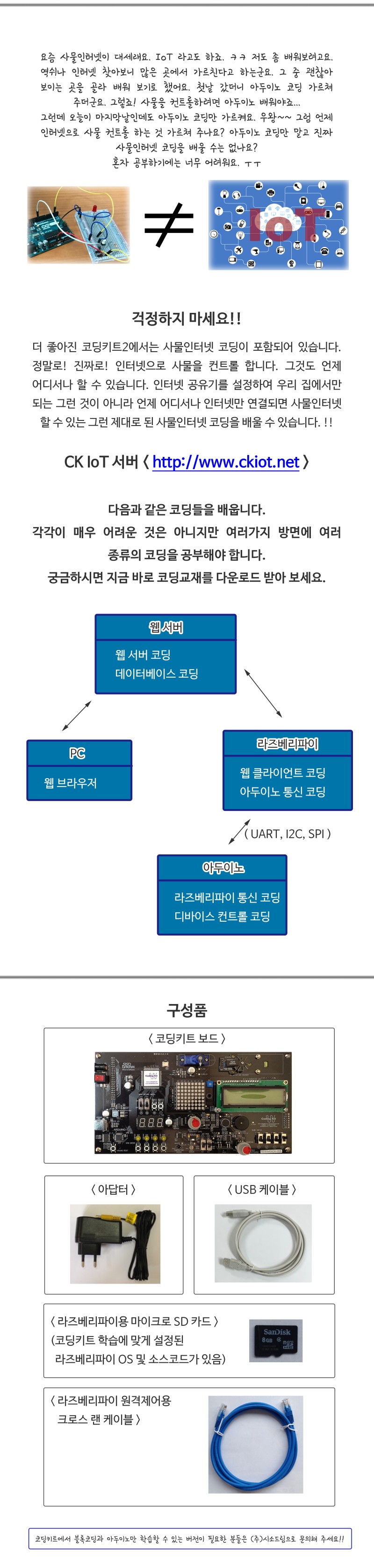 구성품으로는 코딩키트 보드, 아답터, USB 케이블, 라즈베리파이용 마이크로SD 카드, 코딩키트 학습에 맞게 설정된 라즈베리파이 OS 및 소스코드, 라즈베리파이 원격제어용 크로스 랜 케이블 등이 있다.